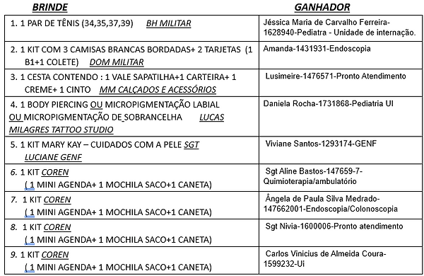 O sorteio de fardamentos estará restrito a militares da enfermagem do HPM/NAIS/SAS, não se estendendo a parentes de funcionários civis, de modo que se um funcionário civil for sorteado, será feito novo sorteio até que um militar seja contemplado e este civil ganhará o próximo brinde;